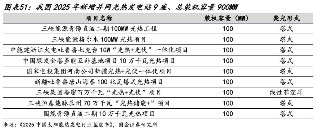 我国目前在建、待建及规划的光热发电项目较多,未来装机规模有望持续高增。根据太阳能光热产业技术创新战略联盟统计,截至2025年末,我国处于实质性建设阶段的光热发电项目约25个,总装机容量3000MW。我国待建及规划的太阳能热发电项目数量约31个、总装机容量约4050MW。按照国际能源署预测,中国光热发电市场到2030年将达到29GW装机,到2040年翻至88GW装机,到2050年将达到118GW装机。