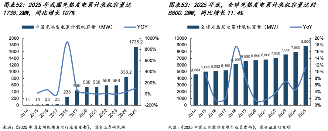 根据太阳能光热产业技术创新战略联盟,2025年,我国新增并网光热电站9座、总装机容量900MW。截至2025年底,我国光热发电机组累计装机容量达到1738.2MW(共27座),较2024年增长107%。2025年全球累计装机容量达到8800.2MW,同比增长11.4%,得益于2025年中国累计装机规模的翻倍增长,全球总装机规模也实现加速提升。