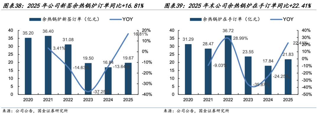 海外市场需求上行,看好公司后续出口订单持续提升。根据公司官微,公司近年来发力海外市场,HRSG远销东南亚、南美洲、非洲、中东等“一带一路”沿线国家及地区。近年来,公司斩获了批量的海外项目订单,海外订单占比超20%。标志性项目包括巴基斯坦必凯9H级HRSG(当时全球容量最大的联合循环电厂项目)、尼日利亚12台9E燃机余热锅炉项目(全球最大的天然气自备电站订单)等。未来,公司规划加快全球布局,全力推动燃机余热锅炉全球化及北美市场的订单机会落地,看好公司海外订单持续提升。2025年公司新签余热锅炉订单19.67亿元,同比+16.81%;年末在手订单21.83亿元,同比+22.41%,订单加速提升。