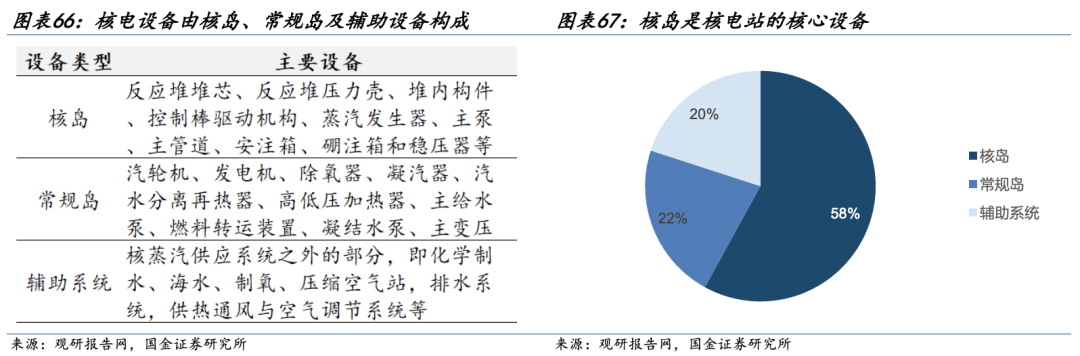 上游核电设备主要指核电站的组成设备,主要分为核岛设备、常规岛设备和辅助系统三类。其中核岛是整个核电站的核心,负责将核能转化为热能,是核电站所有设备中工艺最复杂、投入成本最高的部分,投资成本占比达到58%。