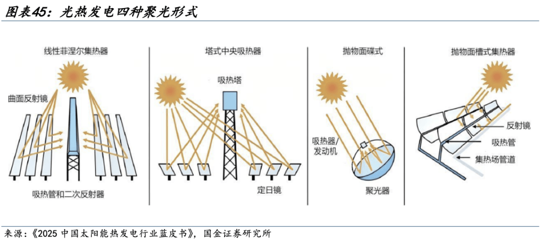 我国光热发电项目主要以塔式电站为主,海外以槽式为主。根据《2025中国太阳能热发电行业蓝皮书》,2025年我国光热发电累计装机容量中,塔式占比70.82%,槽式仅约占10.93%,与国外装机比例相差较大,主要原因是导热油槽式产生的主蒸汽温度为380℃左右,而熔盐塔式主蒸汽温度为550℃,塔式的热电转换效率高。此外,我国2016年以来运行的塔式电站的熔盐吸热器可靠性较高,因此我国大多数新投资电站选择了热电效率高的塔式聚光技术路线。