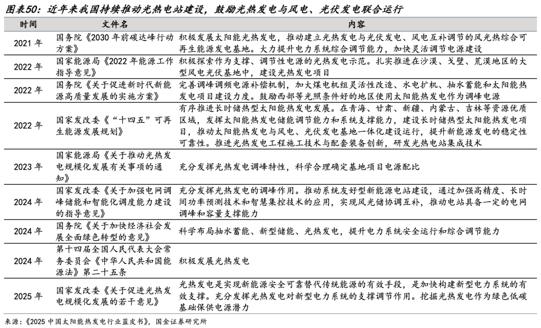 我国对光热发电的重视程度较高,近年来鼓励发展政策频出。基于光热电站自带储能的特性,可与光伏、风电组合,提升国内可再生能源的并网比例。近年来,我国多次推出鼓励光热发电技术发展的政策。2025 年12月,国家发展改革委《关于促进光热发电规模化发展的若干意见》明确提出:光热发电是实现新能源安全可靠替代传统能源的有效手段,是加快构建新型电力系统的有效支撑。