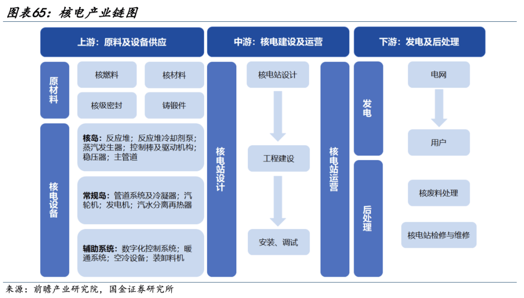 核电产业链可分为上游、中游、下游三个主要环节。上游为原材料与设备制造,中游为核电站建设与运营,下游为乏燃料处理与核电综合利用。